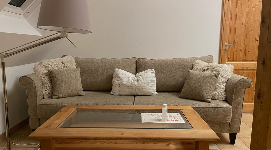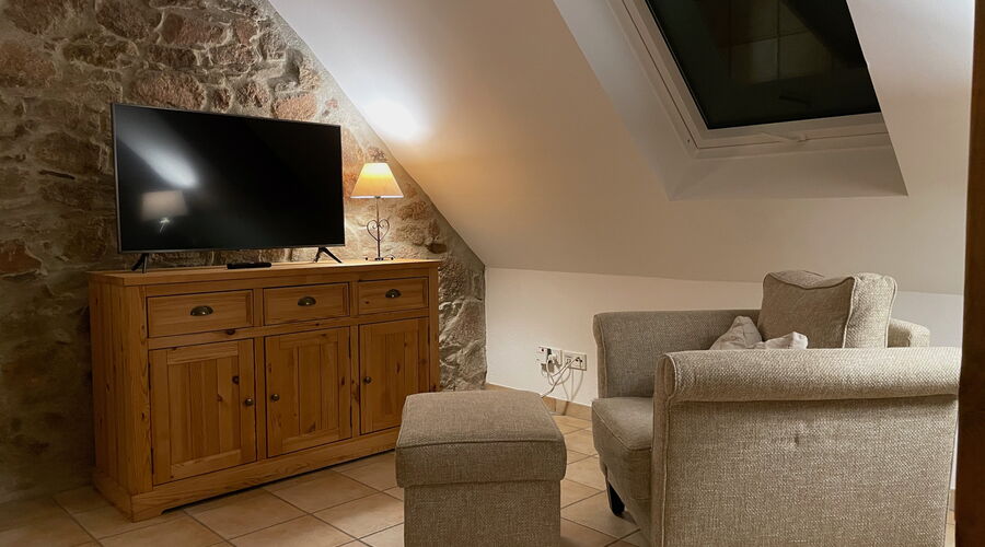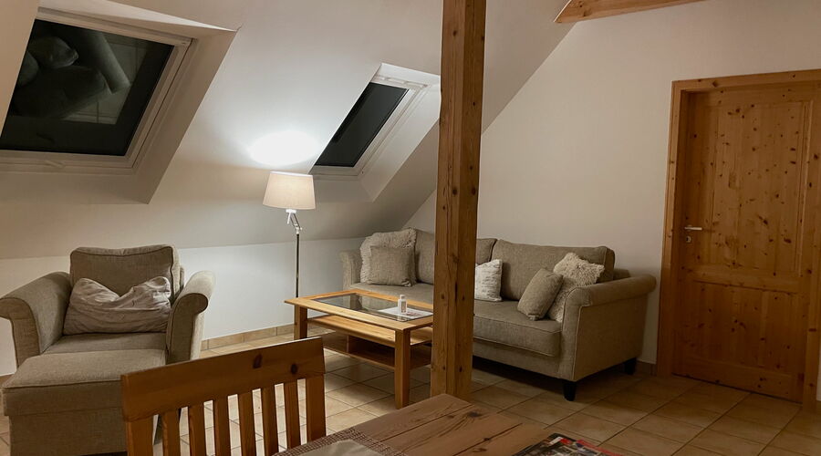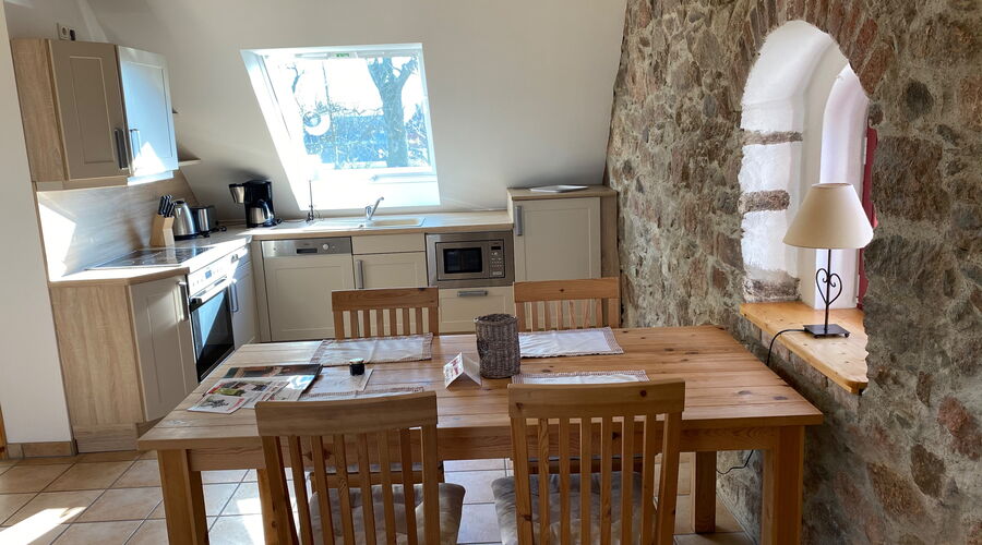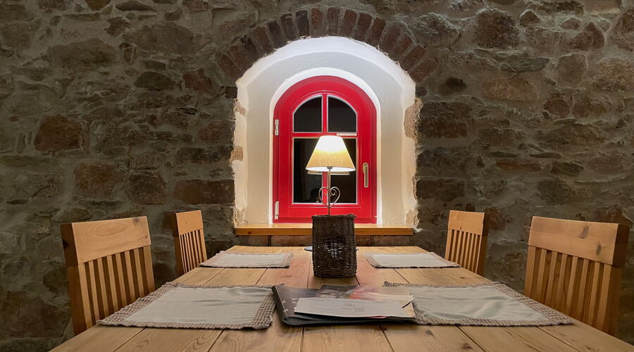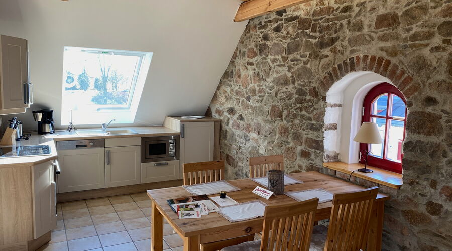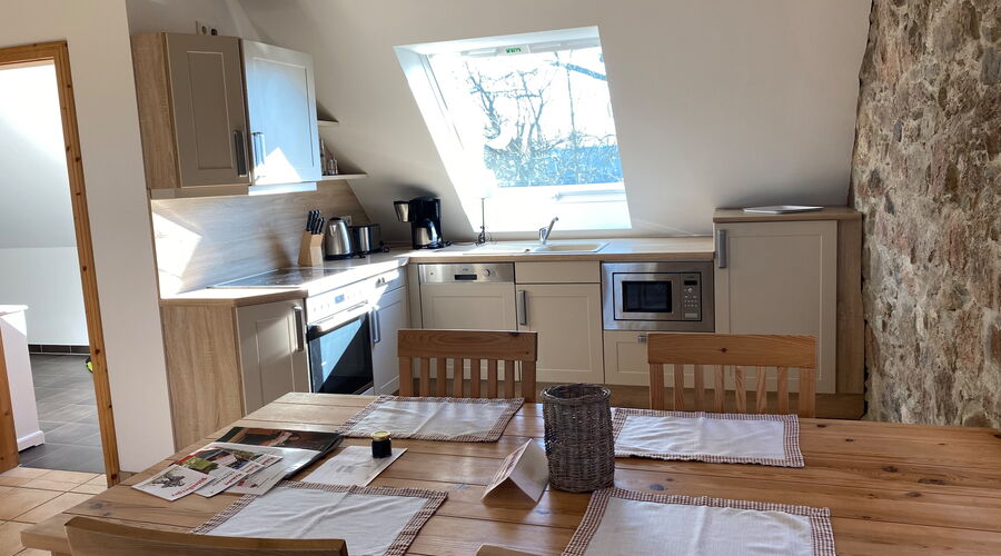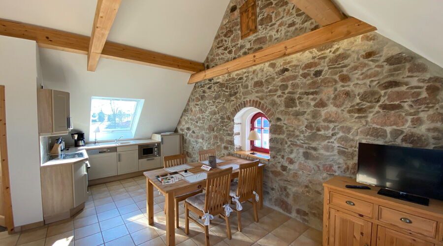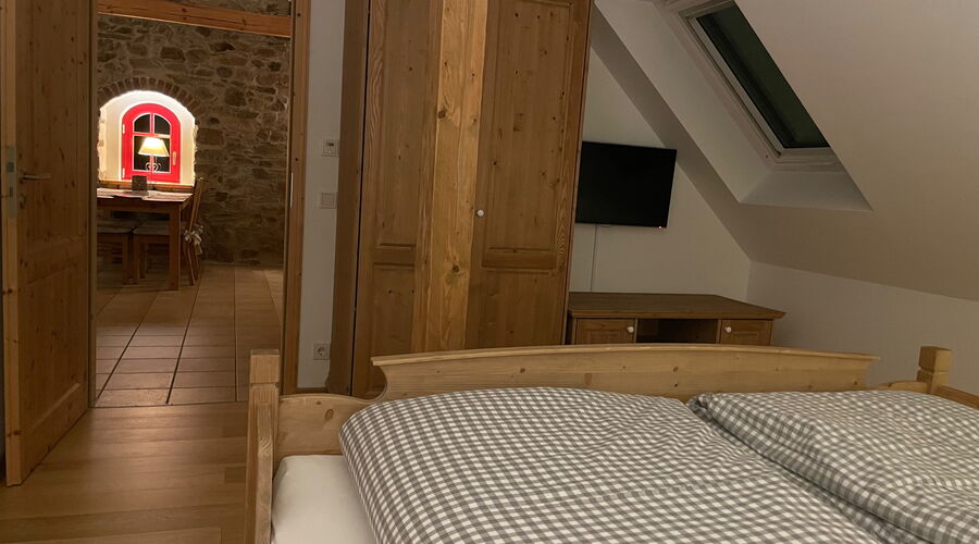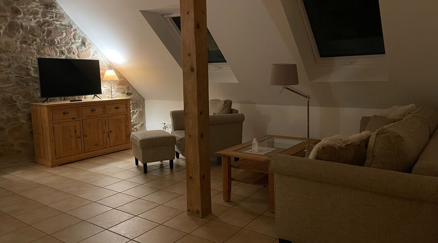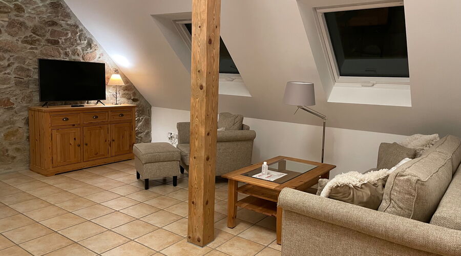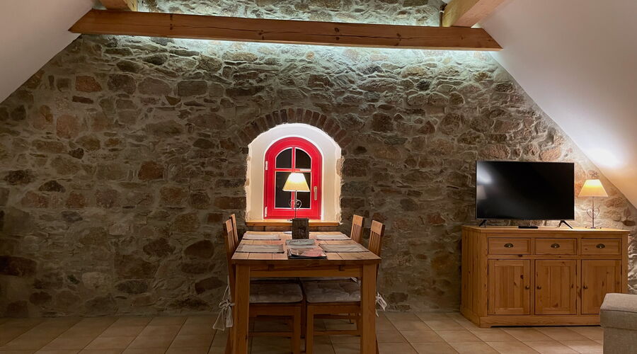 Das 45 m² große romantische Appartement "Gänseblümchen" mit Blick auf die Landschaft befindet sich in der Wellnessscheune im Obergeschoss. Es enthält ein separates Schlafzimmer, ein großes Bad und eine gemütliche Wohnküche im romantisch rustikalen Stil. Genießen Sie Wohlfühlambiente mit modernsten Komfort. Den besonderen Charakter bildet die alte erhaltene Felssteinwand.