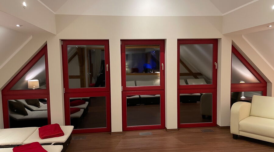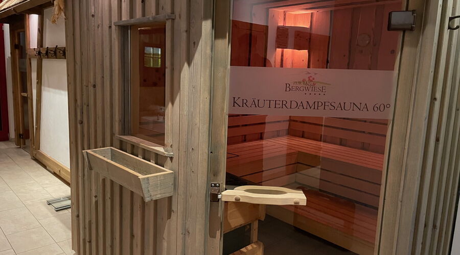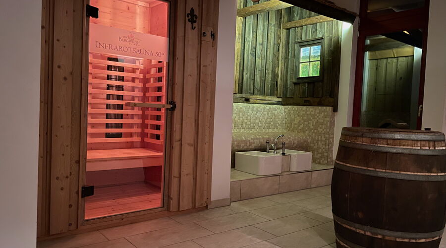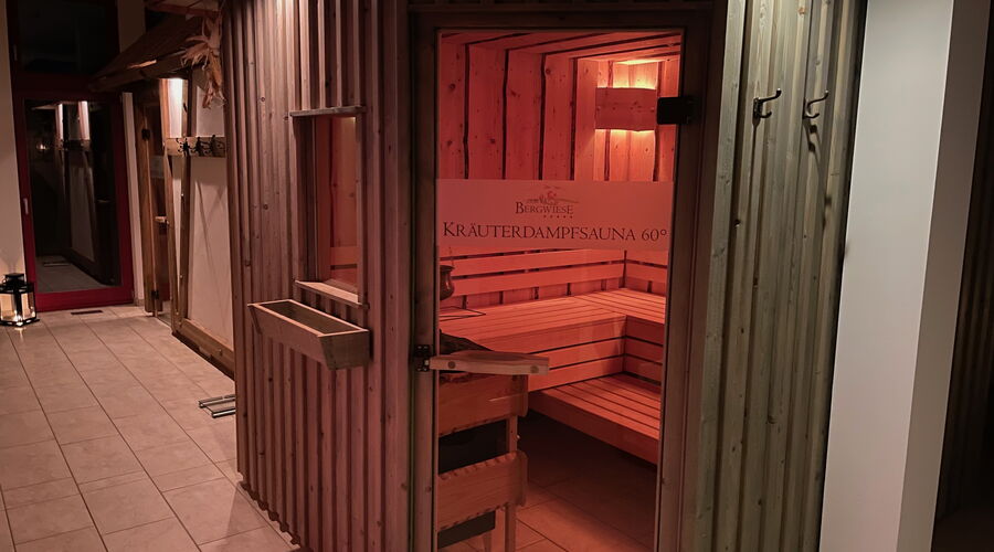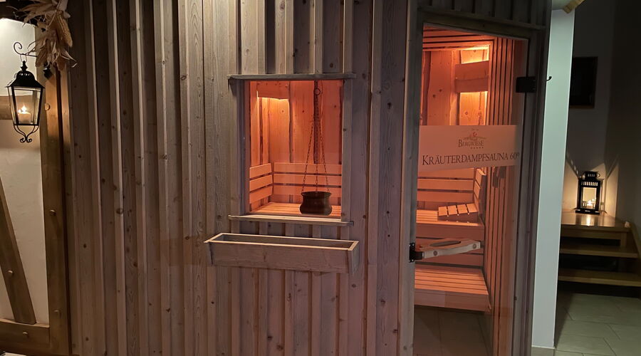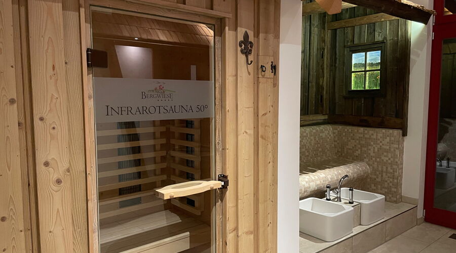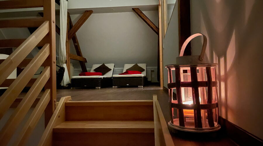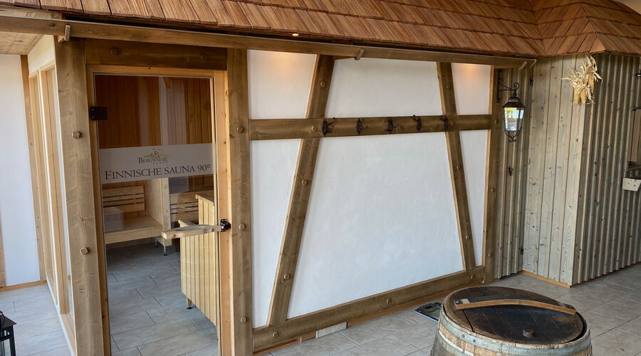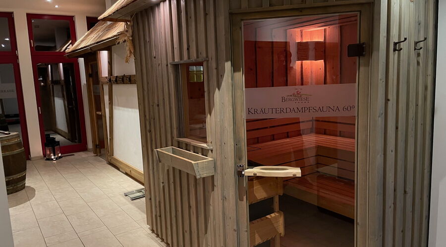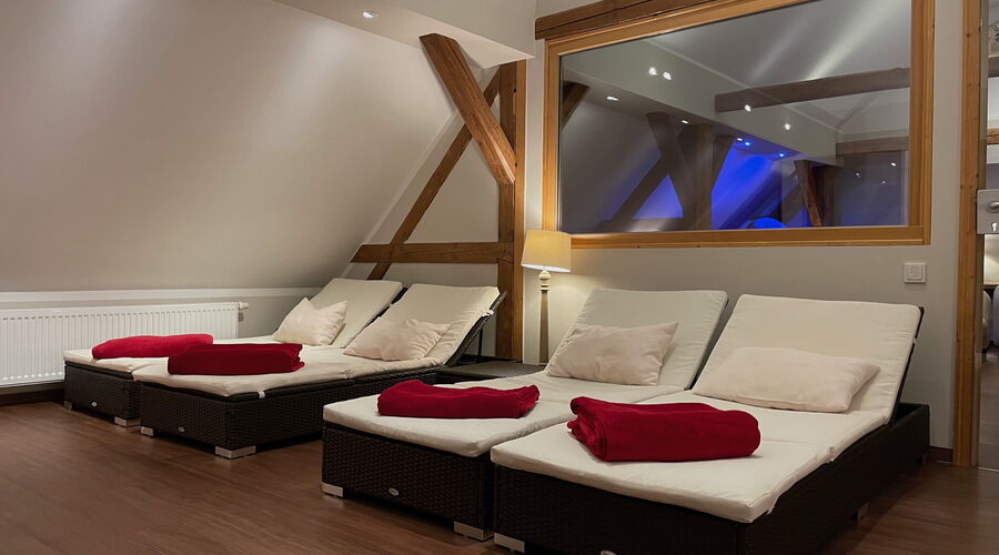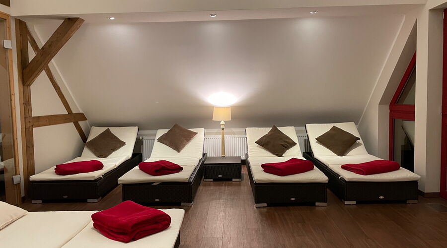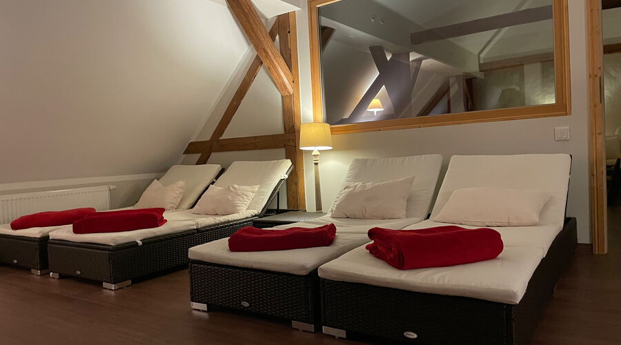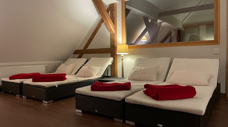 Es erwartet Sie ein Wellnessbereich mit einer großzügigen finnischen Sauna 90 °C als altes erzgebirgisches Fachwerkhaus mit heimische Holzdachschindeln, eine Dampfsauna mit aromatischen Bergkräutern 60°C als alten Holzschuppen, eine gesundheitsfördernde Infrarotkabine, Wärmebank mit einer Kneipp-Station und eine gemütliche Ruhelounge zum Entspannen. Die 4 Erlebnisduschen kühlen Sie abwechslungsreich ab. Die Terrasse mit Sitzmöglichkeiten lädt zum Durchatmen in der Gebirgsluft ein.
